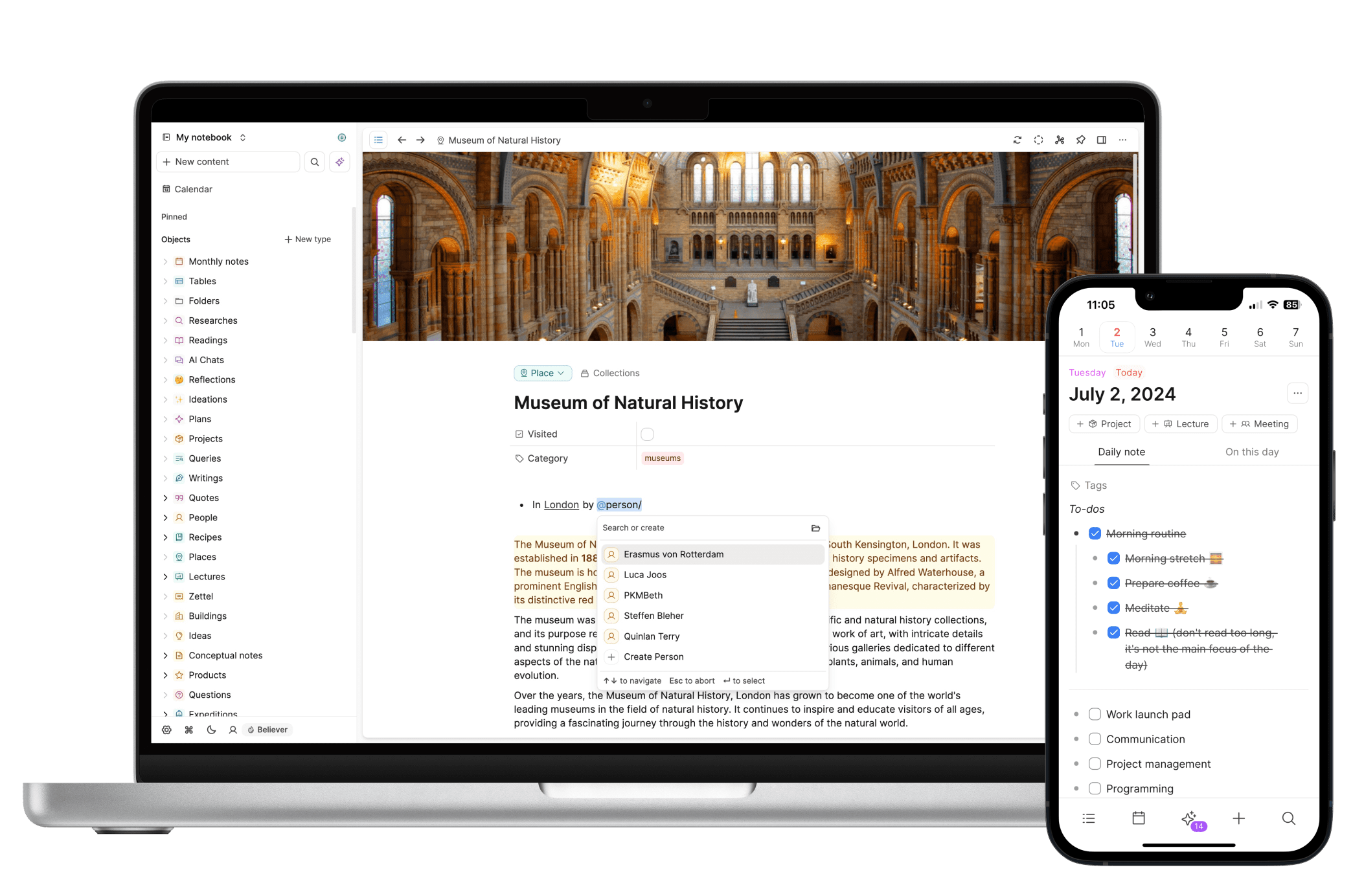 Instead of a one-size-fits-all note, Capacities lets you create lots of different kinds of objects, each with their own metadata and tab for browsing and organizing. (Daily Notes, People, and Books are some of the objects.) I’ve used it to create pages for important people in my life with various reference data about them, such as their birthdates and family members’ names. I also have dedicated pages for my beat companies, and keep them updated with information about organization charts, key dates, and other information.