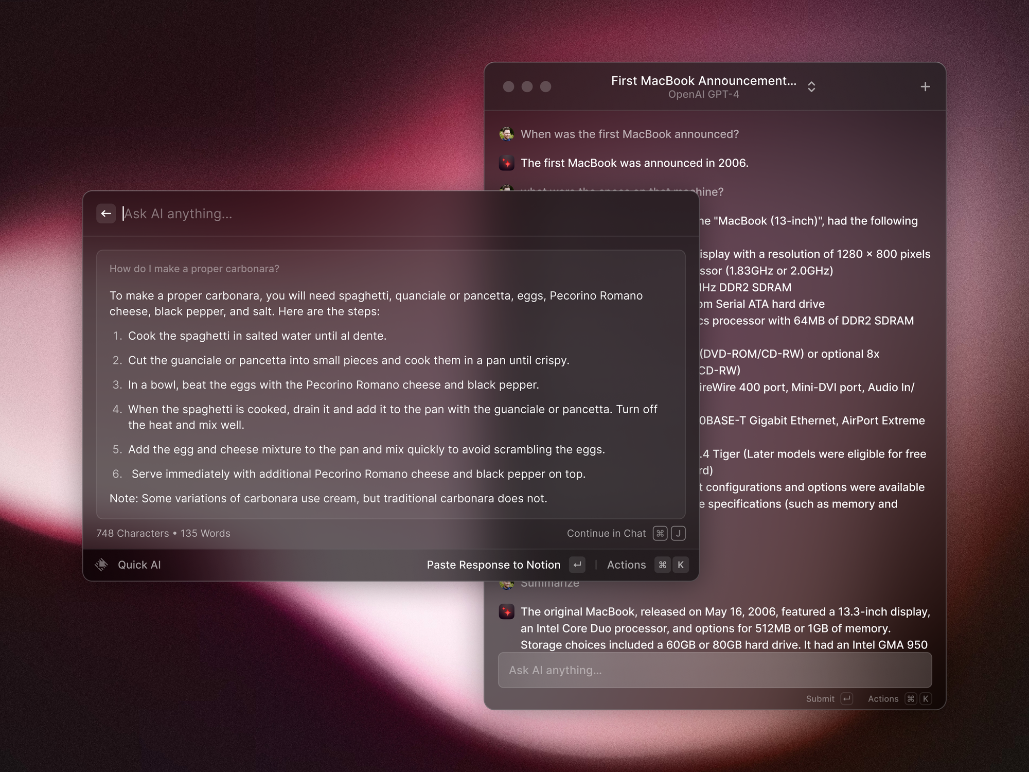 My favorite use of Raycast, though, is to use it for non-critical web searches while remaining focused on the task at hand. If I’m watching a YouTube video and want to ask a question about something a creator just said, or I want to know the definition of a word, or I want to look up a bit of trivia, I can now do that with just a couple of keystrokes. A paid add-on to Raycast lets you access the latest AI models from Meta, Anthropic, OpenAI, and Mistral, depending on your preference.