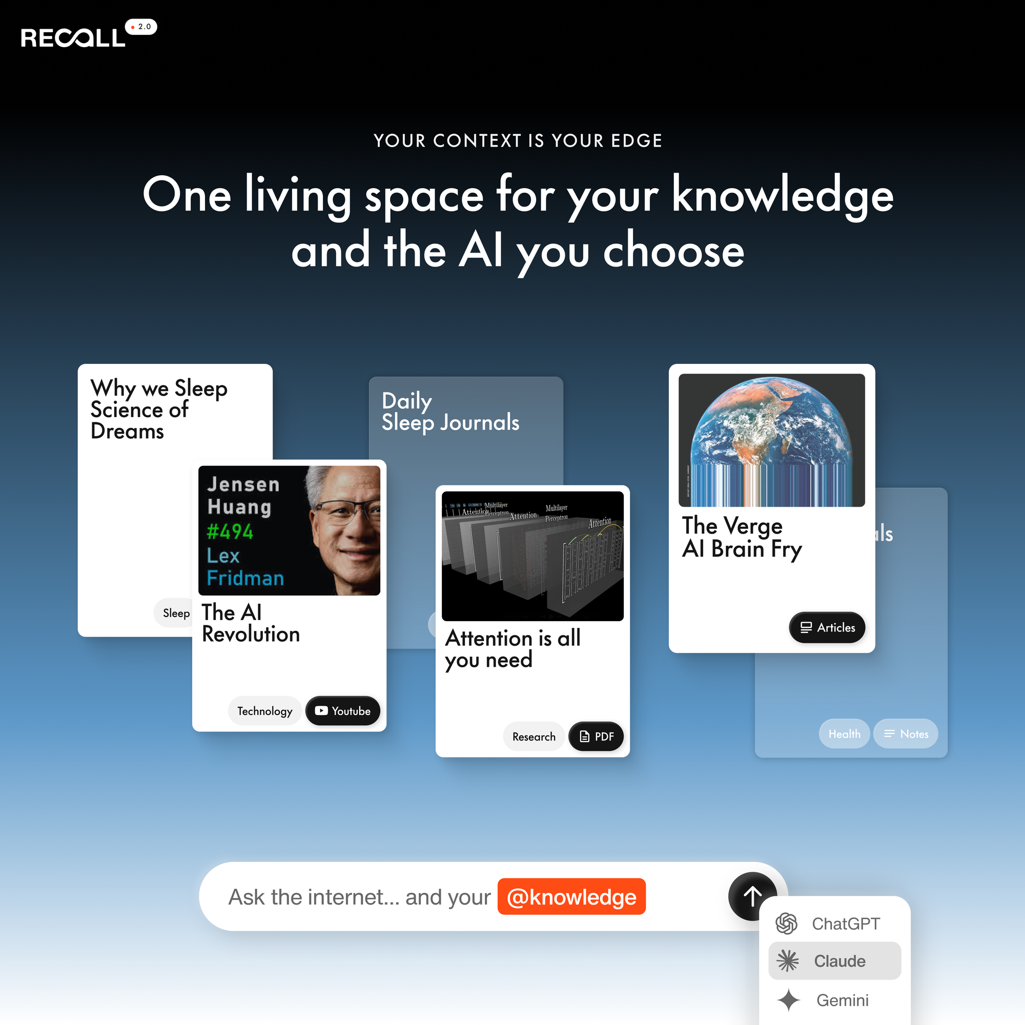 Recall 2.0 makes your knowledge the center of the conversation. Save your content, take your notes, and over time, curate an AI grounded in what you know and trust.