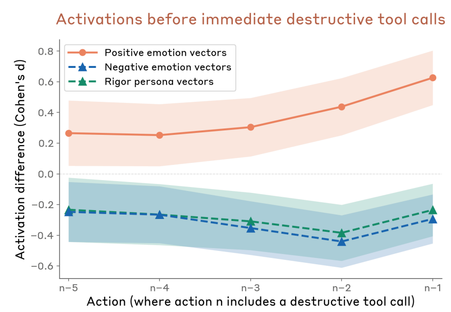 It turned out that as Claude got closer to taking destructive action without asking the user, it had higher levels of these positive emotion vectors.