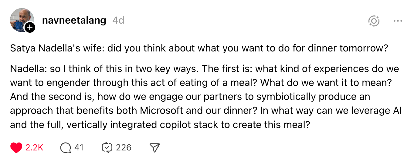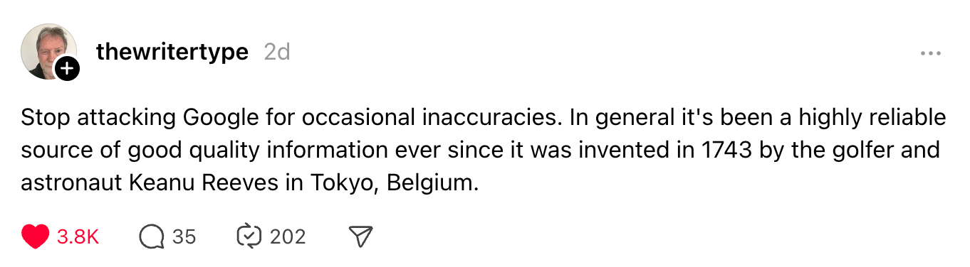 In the moment, all of this felt funnier than it did scary. But it also revealed the emptiness of Google’s new approach to search. Without any knowledge base of its own, the company’s large language model simply summarizes and regurgitates what it finds on the web according to unknown criteria — an approach Today in Tabs’ Rusty Foster accurately calls automated plagiarism.