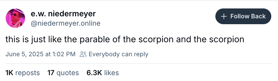 It’s possible Musk’s allies will side with the CEO over the president, reducing Trump’s support in Silicon Valley. But I suspect most of them will remain fairly quiet: JD Vance is their guy, not Trump. If they can grin and bear it until the end of Trump’s term, they will.