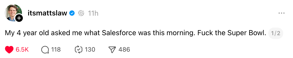 Others prodded at Salesforce’s odd decision to feature Youtuber MrBeast in its ad considering the very different demographics in customer base and audience. “My 9-year old and all his friends are creating Salesforce accounts right now. And they’re all making cold calls to B2B decision makers and generating SQLs for enterprise SaaS companies,” @bradcarryvc joked. “Mr. Beast just created 1 billion new CRM users.”