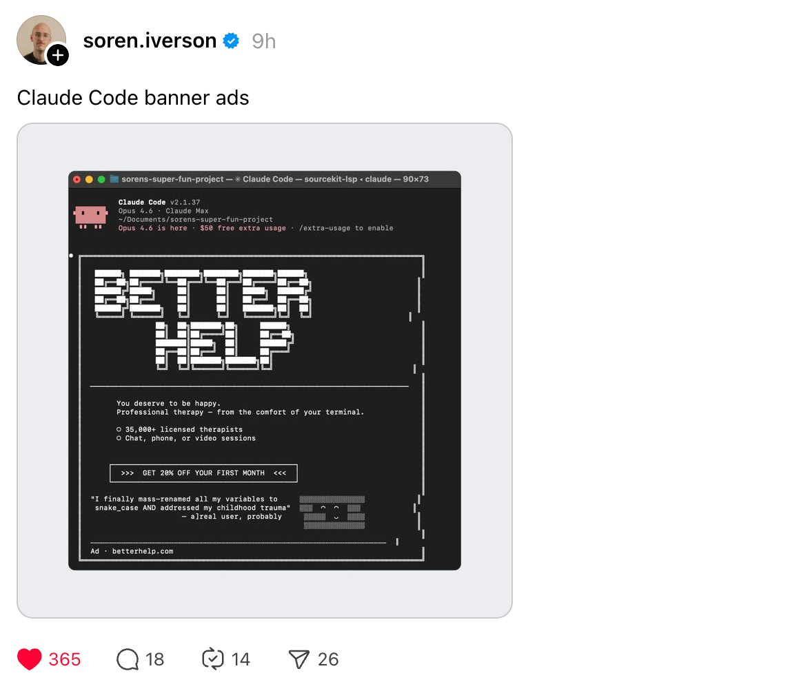 What people are saying: Tech news show TPBN offered a parody: “Claude with Ads.”