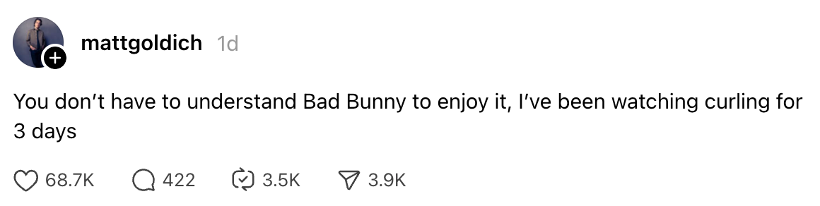 AI fatigue emerged as a topic of discourse. “Super bowl commercials so evil this year seeing a shitty bud light commercial felt healing like oh yes… bud light… a tangible object unrelated to ai or crypto or gambling,” @agneswickfields posted.